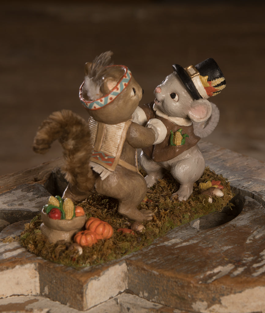 Being Thankful to gather with friends and family is what Thanksgiving is all about. This little mouse and squirrel by Bethany Lowe Designs are displaying this in the most joyful way, Dancing! The squirrel is dressed in Native American attire and has a thick faux fur tail while the mouse is dressed in pilgrim attire and has a chenille tail. The smiles on these two faces are everything!!