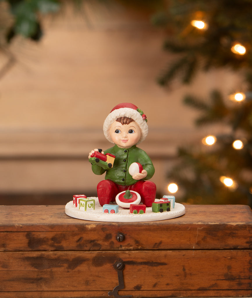 Little Carson is enjoying his playtime with all of his new Christmas toys. Carson is sitting inside playing with his train, ball, and blocks. This adorable figurine is sure to captivate the most wonderful memories during the holiday season.