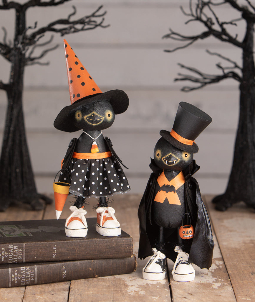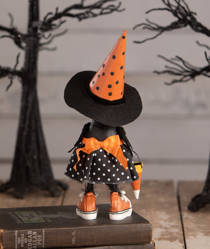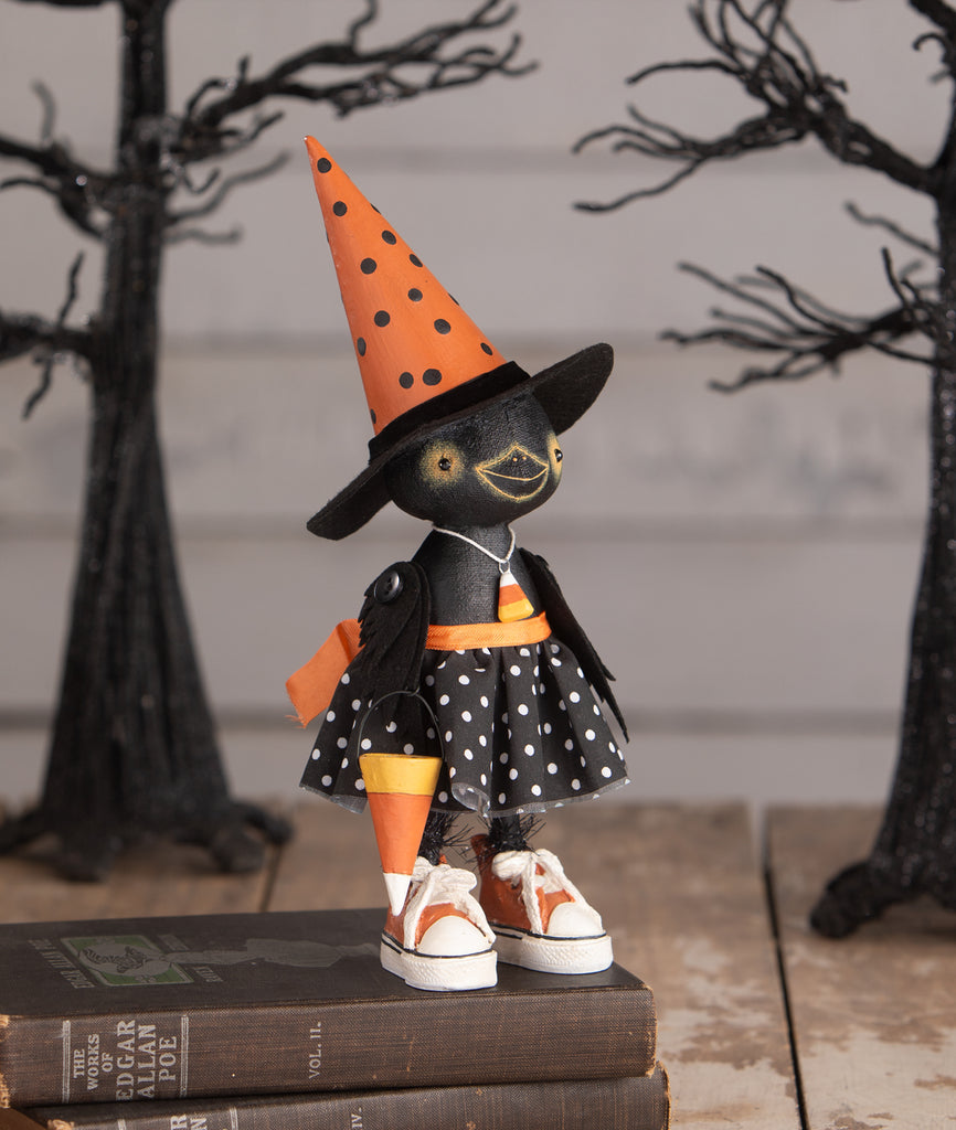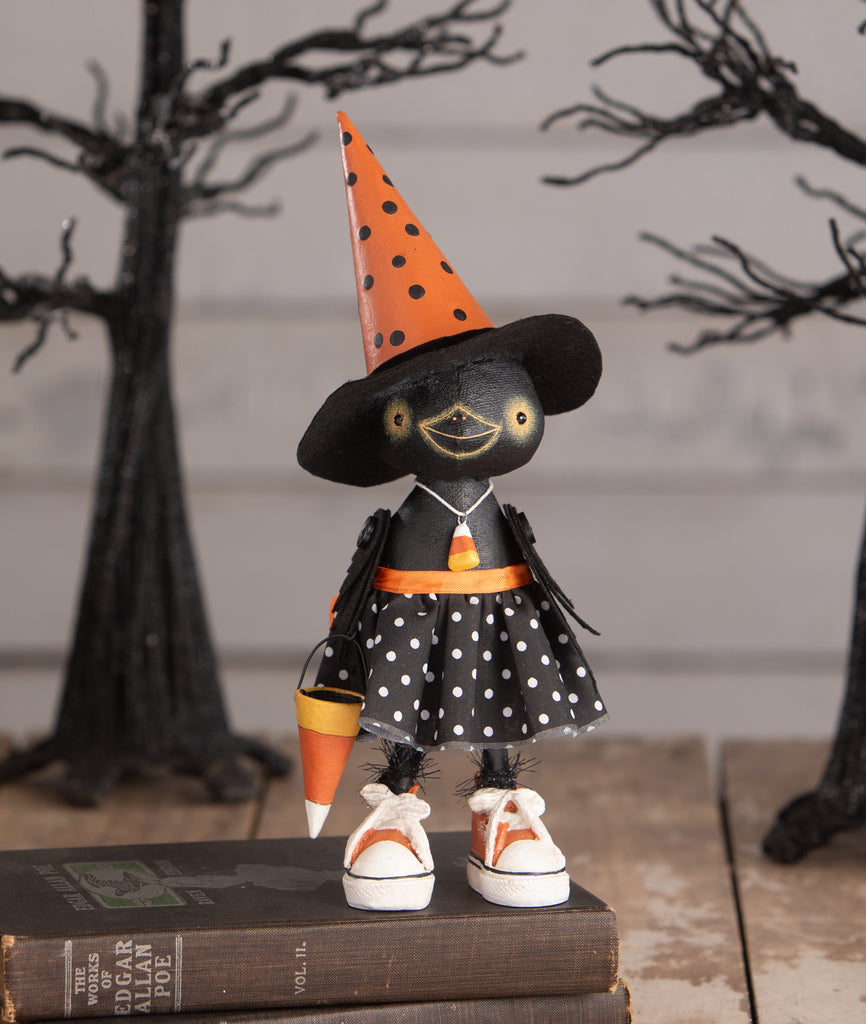 Meet Clara Crowloff, the quirky and stylish crow by Robin Seeber! Standing tall on her stilt legs and sporting orange sneakers, Clara is ready to make a statement. Dressed in a black skirt with white polka dots and an orange witch hat to match, she carries a candy corn cone from her right wing for a touch of sweetness. With her whimsical outfit and playful details, Clara is the perfect addition to your Halloween decor, bringing charm and a dash of personality to your spooky setup!