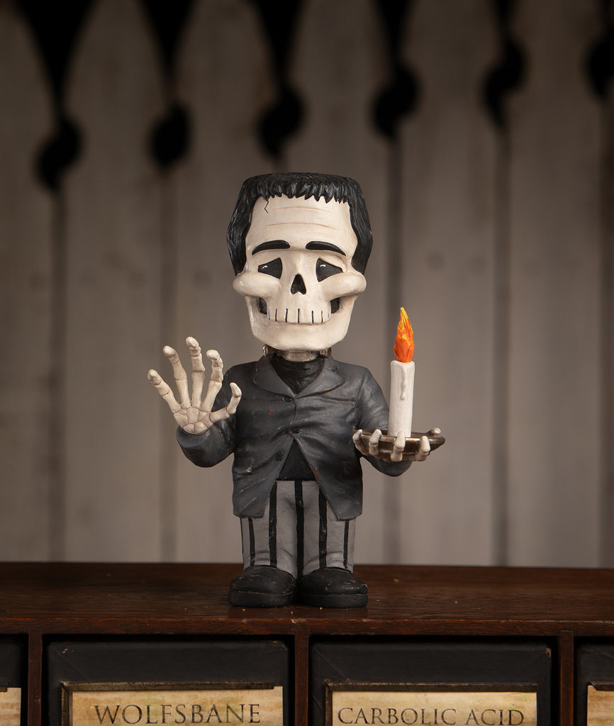 Introducing Franken Skelly, the spooktacular skeleton that brings a delightful twist to Halloween decor! This Frankenstein-style skelly captures attention with his right hand raised in a claw position, adding an element of playful fright. In his left hand, he holds a charming candlestick holder with a single candle, complete with a whimsical crepe paper flame flickering above. Franken Skelly is perfect for lighting up your Halloween celebrations with a touch of eerie elegance and mischievous fun! This piece is carefully antiqued and distressed by hand to give it a unique, vintage look. Each one is truly one of a kind, with slight variations that add to its charm and character.