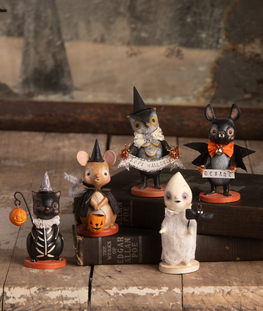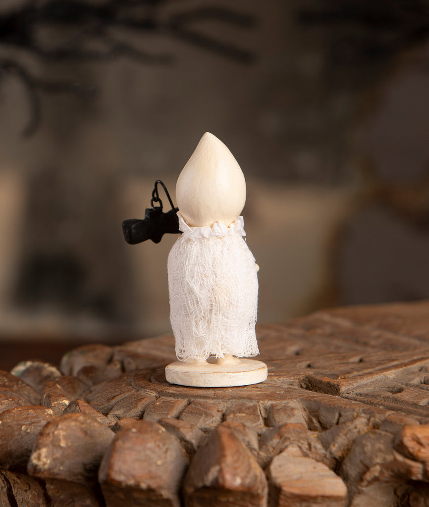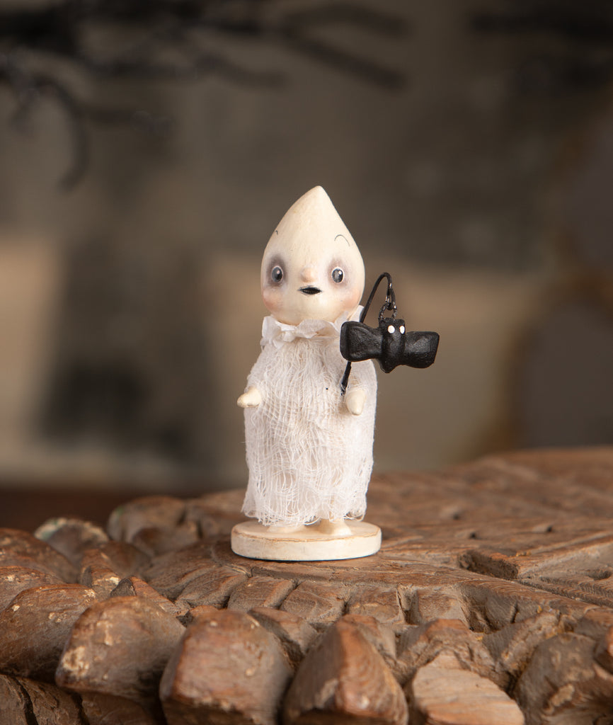 Add a dash of whimsy to your Halloween decor with Going Batty Ghost by Michelle Lauritsen! This charming little ghost, draped in a soft gauze overlay, is dressed to impress with a cute crepe collar. In one arm, he holds a delicate staff with a bat dangling from the end, ready to bring some spooky fun to your celebrations. Perfect for adding a playful and vintage touch to your Halloween display!