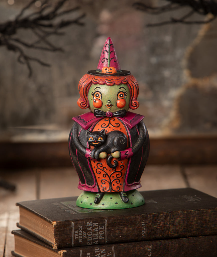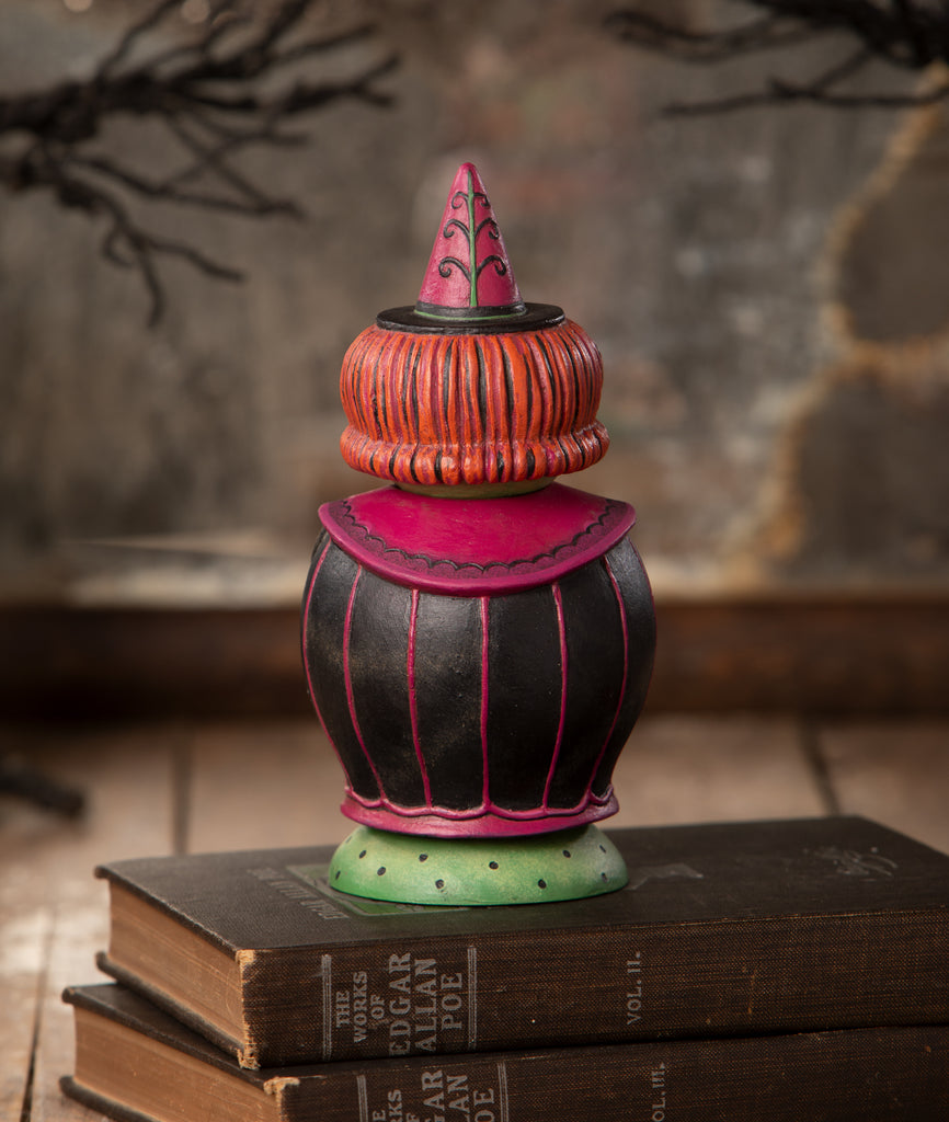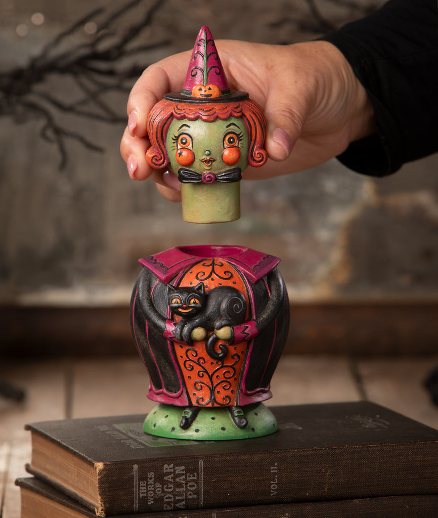 Cast a spell with Johanna Parker’s enchanting Hagatha and Jack Spooks Jar! Dressed in a black cloak with purple accents and an orange dress adorned with vine detailing, Hagatha holds her trusty black cat, Jack. But there's more magic—Hagatha’s head lifts off to reveal a hidden container inside! Perfect for storing little treats or adding a touch of spooky charm to your Halloween decor, this bewitching piece is a delightful way to celebrate the season.