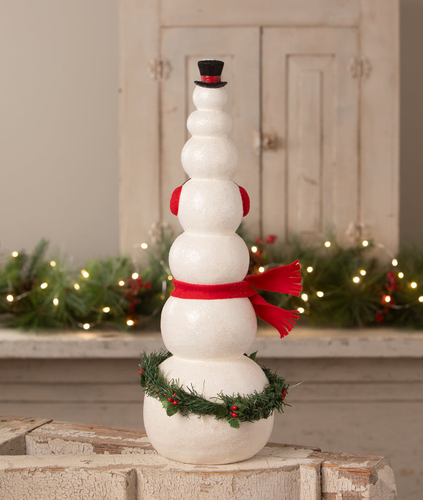 Bring whimsical charm to your holiday décor with our Happy Snowman Stack! This enchanting tower features seven cheerful snowman heads, stacked from largest at the bottom to smallest at the top. Each snowman head boasts a unique and endearing face, brimming with personality and holiday cheer. The top snowman wears a classic black top hat, completing the festive design. Covered in sparkling glitter, this tall and playful piece adds a magical glow to mantels, tabletops, or any holiday display. A delightful way to bring smiles and seasonal joy to your home!