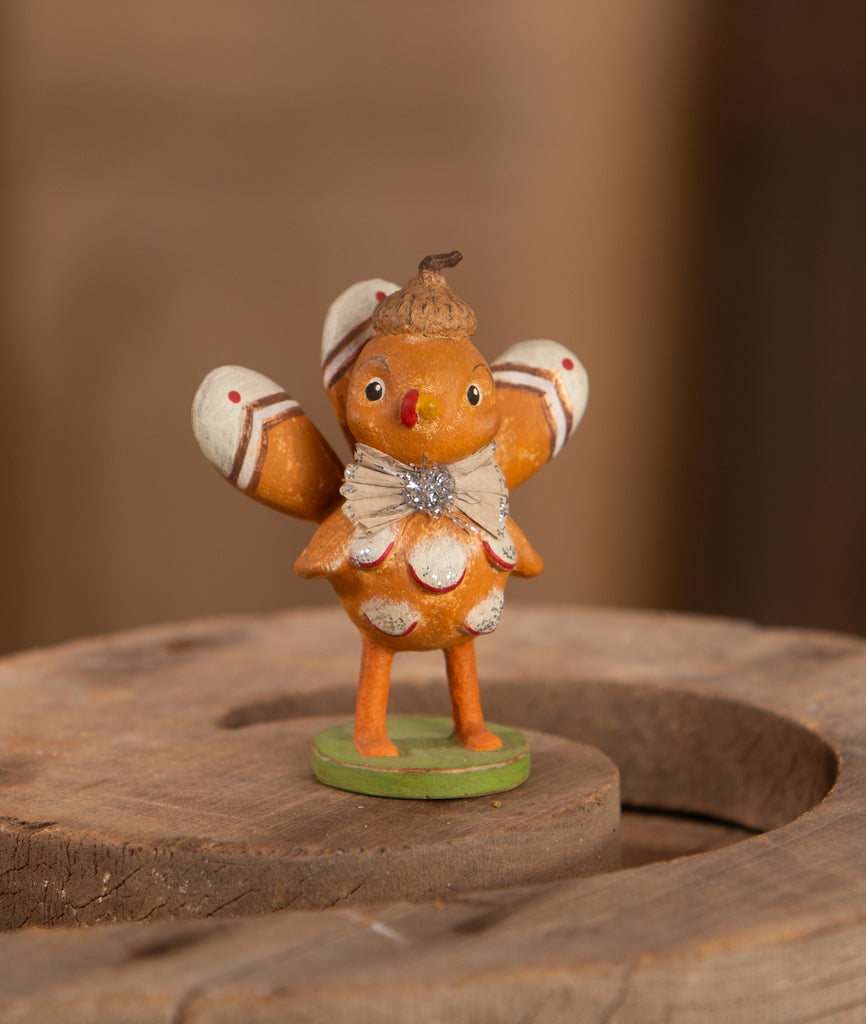 Celebrate the season with the adorable Happy Thanksgiving Turkey by Michelle Lauritsen! This charming little turkey spreads its wings wide, dressed in a festive crepe paper bow tie and topped with a sweet acorn cap on his head. Perfect for adding a playful and heartwarming touch to your Thanksgiving decor, this turkey will bring smiles to your holiday table or display! Hand-painted resin, crepe paper, tinsel, and glitter. 1.5" X 1.5" X 3.5" ML4095