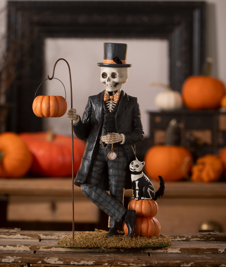 Henry Deadison skeleton is dressed to impress. He is a very dapper skeleton wearing a long black coat, orange and white polka-dot bow-tie, stripped pants and a dark Gray vest. He wears a black top hat with a black floral flower. Henry is lighting the way with a pumpkin dangling off the end of a wire staff. The pumpkin holds a battery operated candle. Henry is out for the evening with his black cat that is dressed as a skeleton and sits on top of 2 stacked pumpkins. Make sure to look for TD4147 Deadra Skeleton!. This pair is..., "simply to die for!"
