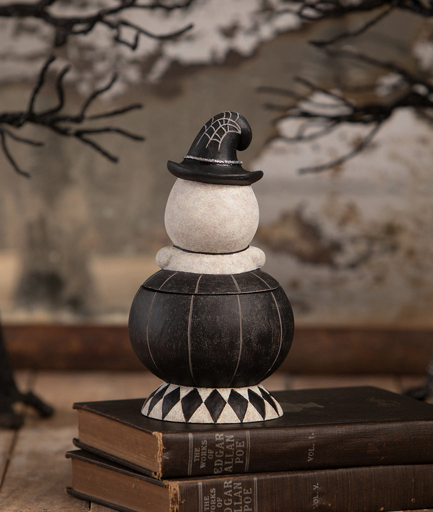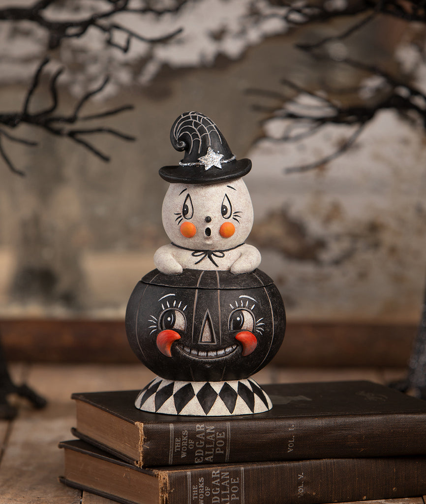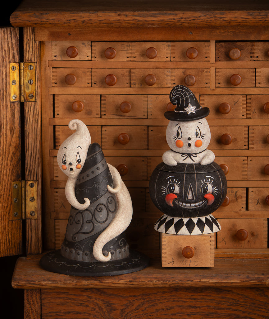 Meet Incognito Gus & Tito, a spooktacular duo from the talented Johanna Parker! Gus, the adorable ghost, peeks out from the top of a mischievous black pumpkin, sporting a cute little witch hat for a charming disguise. Perfect as a Halloween container for sweet treats or standalone decor, this delightful piece brings a touch of vintage-inspired fun and playful mystery to your spooky celebrations!