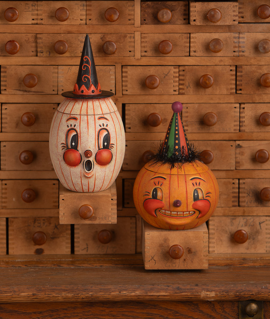 Meet the newest member of the Jackie O-Ween series—Jackie Yell-O-Ween! Bursting with vibrant mustard yellow charm, this whimsical piece is part of Johanna Parker’s beloved collection, where each Jackie comes in a unique color with a unique playful eye design. Like the others, the top of Jackie’s head lifts off to reveal a container, perfect for storing treats or adding a cheerful touch to your Halloween decor. Collect the full series for a colorful and spooktacular display!