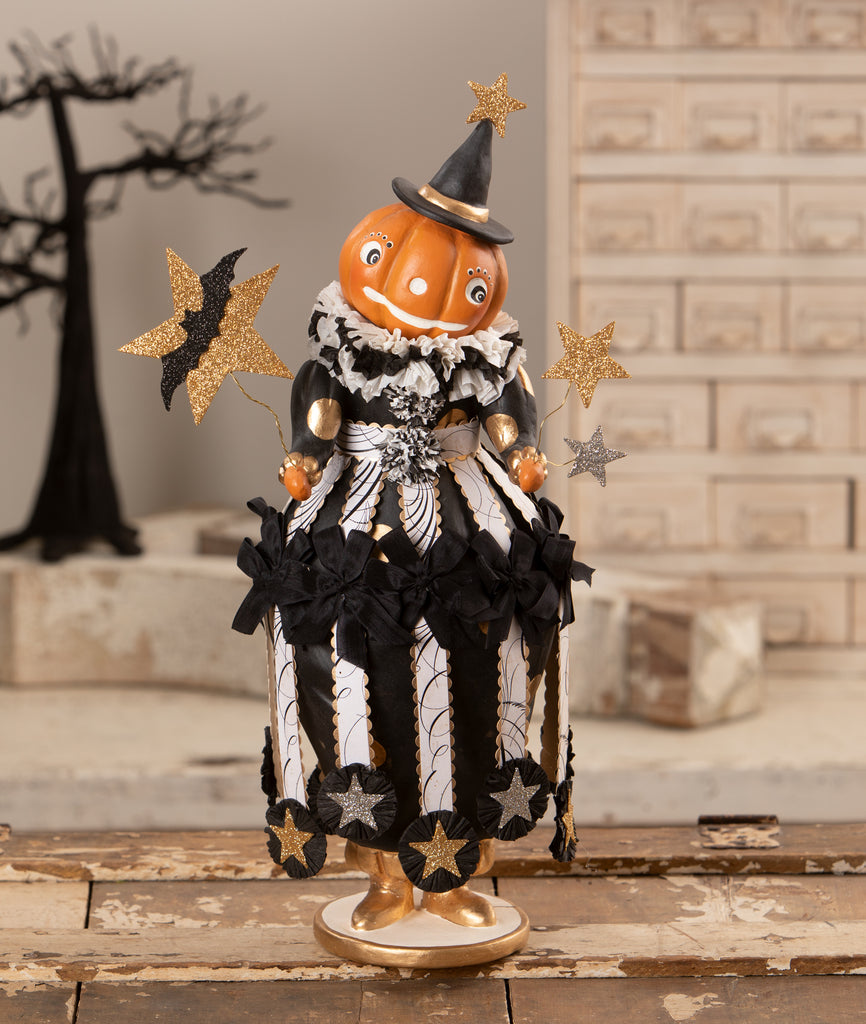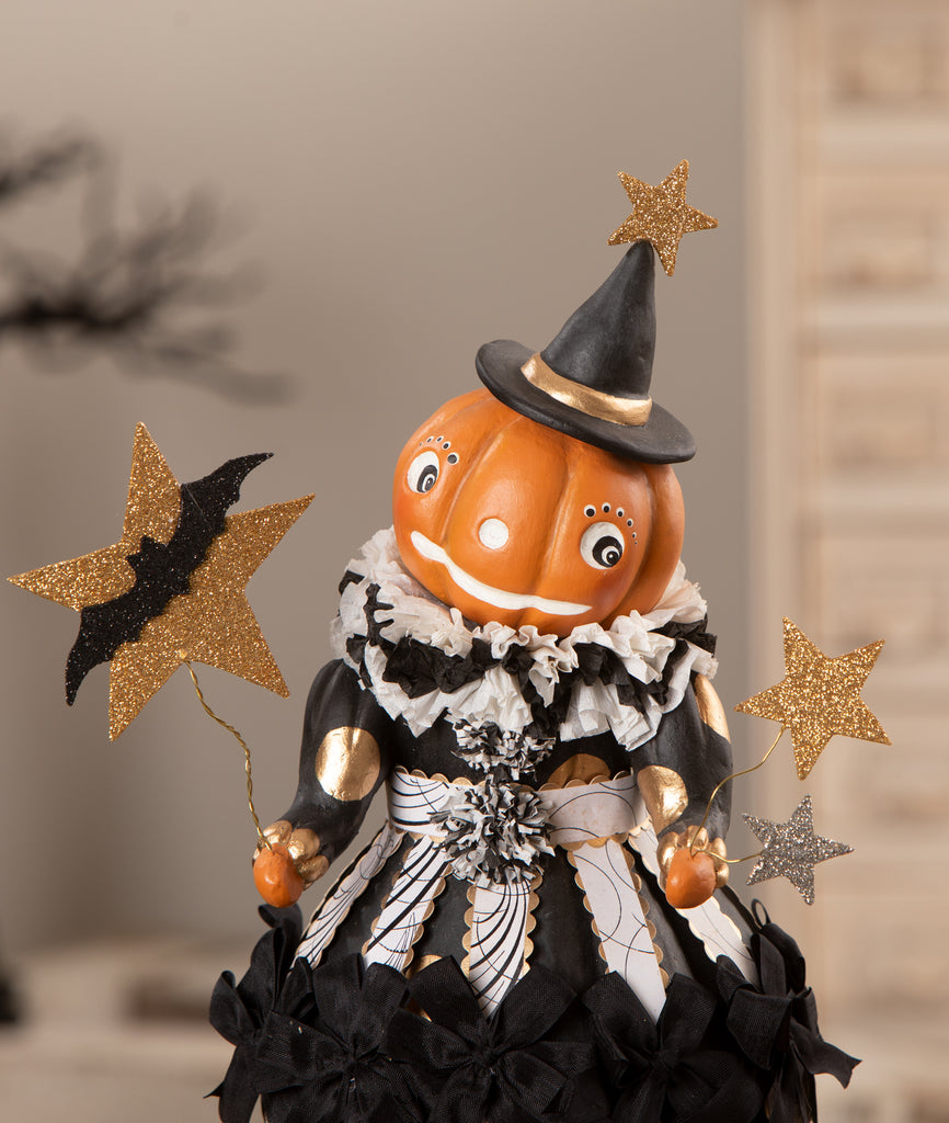 Meet Miss Fancy Pants Jackie, a whimsical and eye-catching creation by artist Dee Foust-Harvey. This tall pumpkin-head figure is dressed to impress in a skirt made of hand cut paper strips, adorned with dainty ribbon bows and rosette embellishments that give her a fanciful, layered look full of texture and charm. Whether displayed on a mantel, entryway table, or as the centerpiece of your Halloween decor, she is sure to capture attention and bring a sense of artistry and fun to the season.