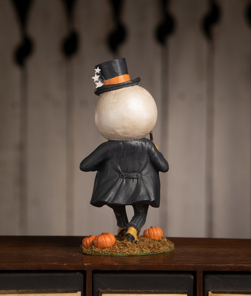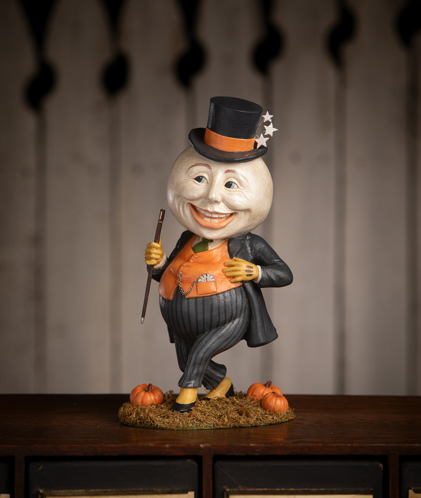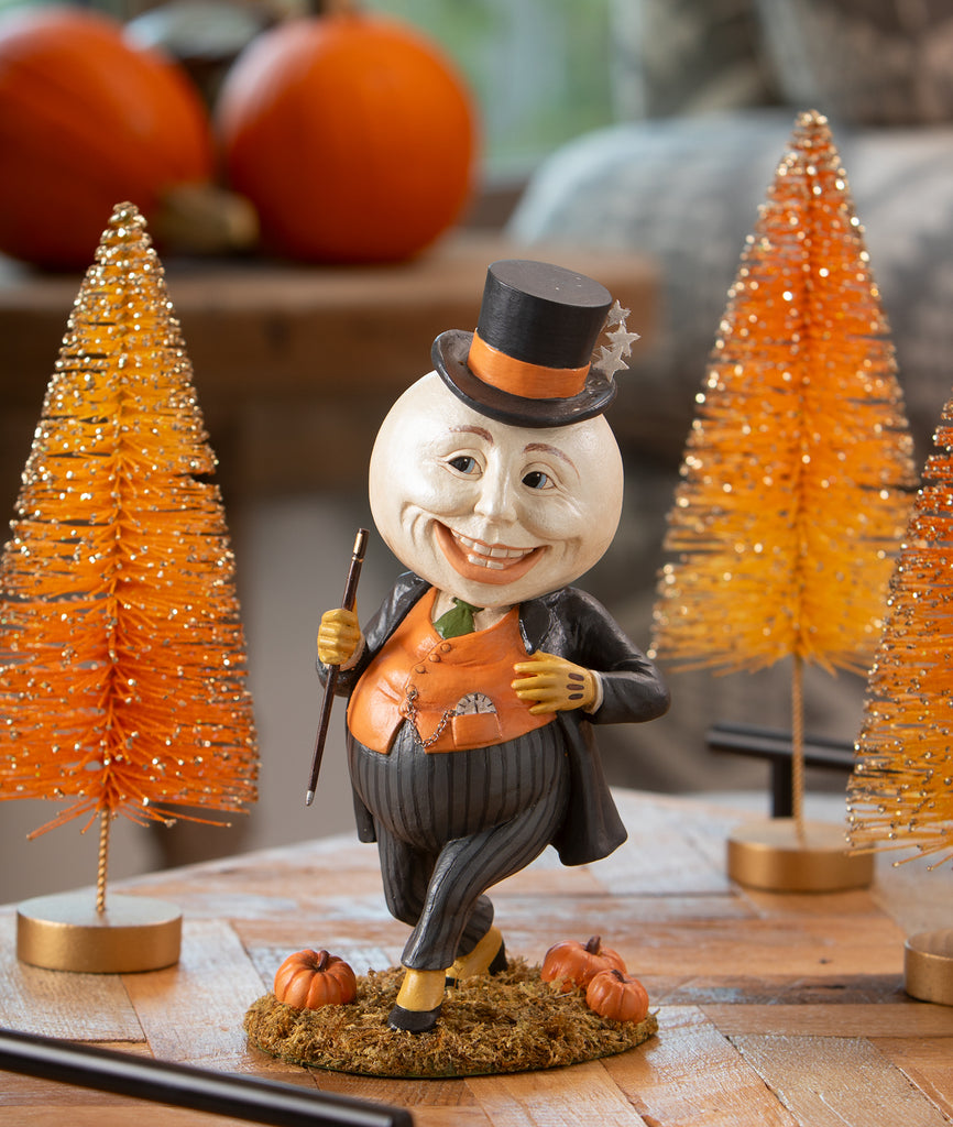 Mr. Harvey Moon Man is proudly leading the Halloween Day Parade! He is a white full moon wearing a black top hat with an orange band. 3 White glittered stars stick out from the hat band. He wears an orange vest and a black coat with black and gray pants. Mr. Harvey is walking on a sculpted grass base with 3 orange pumpkins.