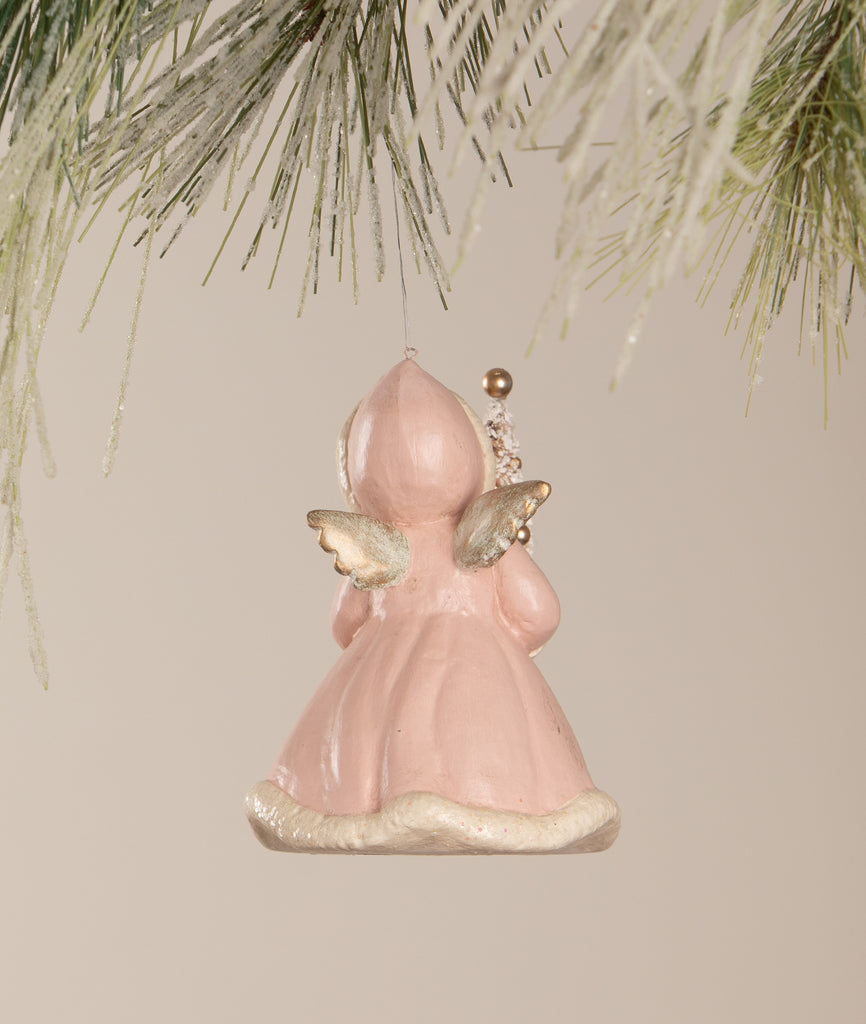 Our sweet celestial angel is wearing a full, flowing gold dress adorned with ruffles up the front. In her hands, she holds a little bottle brush tree with beads. This enchanting ornament captures the essence of serenity and adds a touch of celestial elegance to your holiday décor, embodying the timeless beauty of the season.