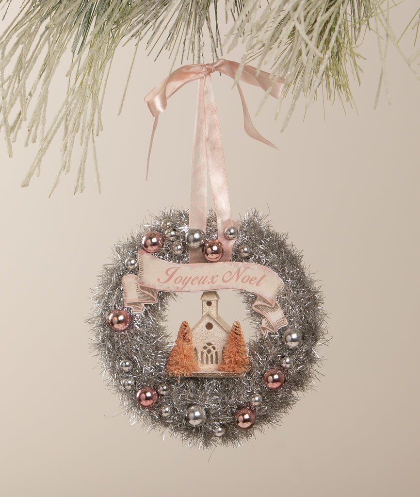 This tinsel wreath ornament by Bethany Lowe Designs is a showstopper! A lovely paper church is placed in the center of a tinsel wreath with pink and silver beads, and a soft pink ribbon. The perfect ornament for your Christmas tree or a precious gift for a special loved one. Tinsel, pressed paper, ribbon, and bottle brush. 7" X 7". SN6800P.