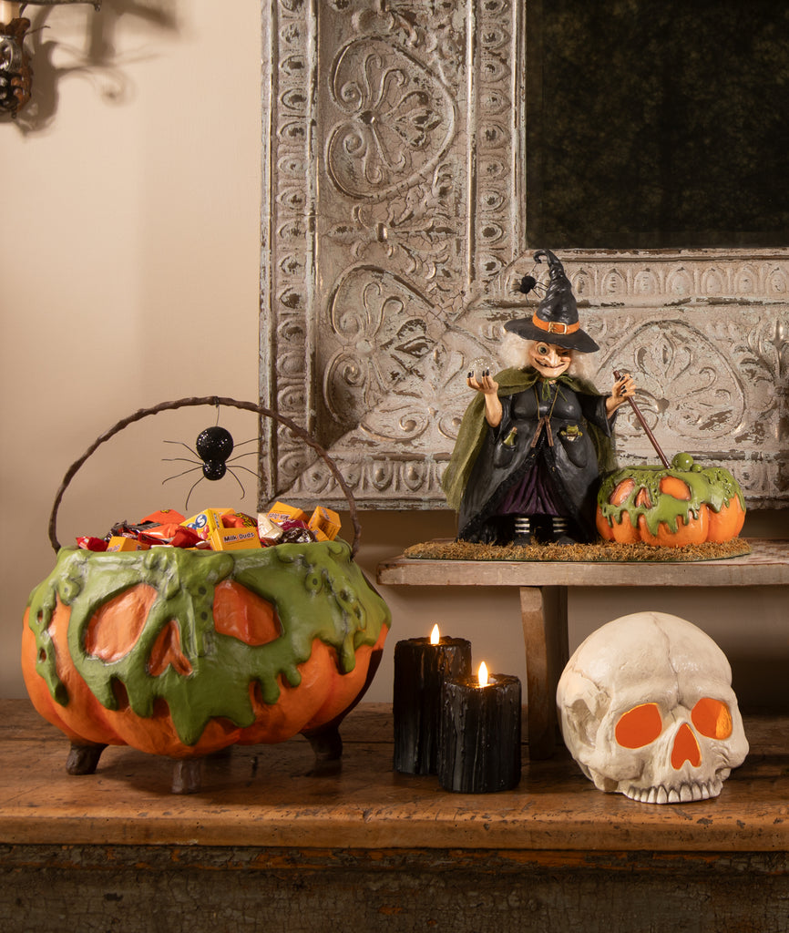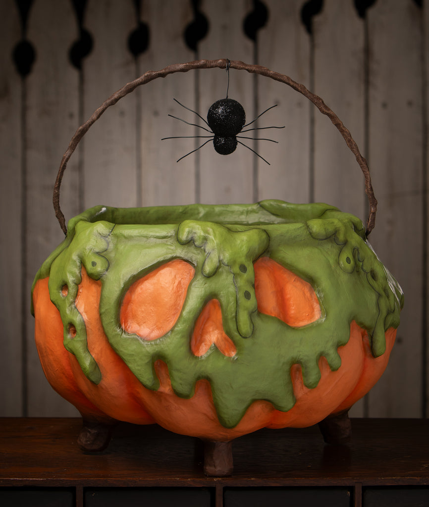 In collaboration with LeeAnn Kress of Charmed Confections our Poison Pumpkin Cauldron is a large paper mache bucket ready to hold all of your Halloween treats. The orange pumpkin cauldron rest on top of 3 feet. Green ooze drips over the top edge of the pumpkin creating a spooky JOL face. Hanging from the brown handle is a black glittered spider with wire legs. This cauldron is a great addition to your Halloween decorations.