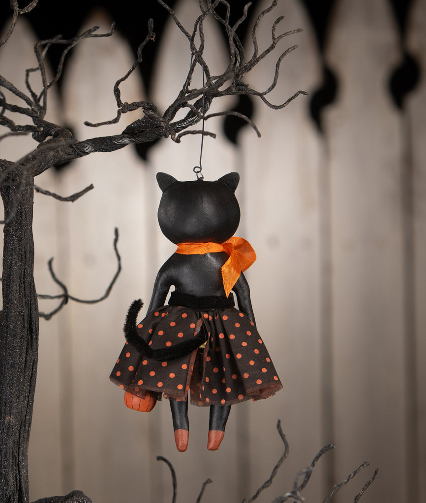 Add a touch of feline fun to your Halloween decor with Sabrina Kitty Ornament by Robin Seeber! Dressed in a playful black skirt with orange polka dots and sporting a fluffy chenille tail, Sabrina is ready for the spooky season. She wears a bright orange ribbon bow around her neck and holds a hand-painted pumpkin bucket, perfect for trick-or-treating. This whimsical ornament is a delightful addition to any Halloween display or tree!