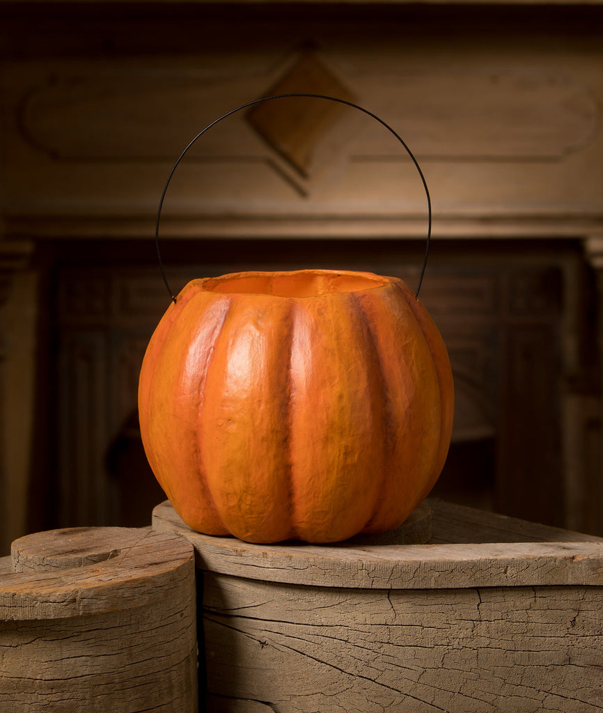 This vintage inspired paper mache pumpkin bucket is perfect for holding Halloween candy or more! Paper mache, vellum, and wire. 8" X 8" X 7". TJ2314.