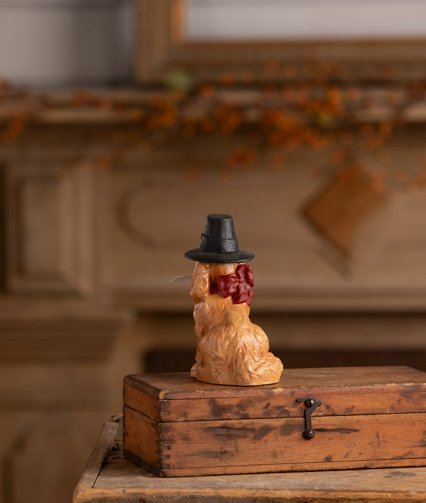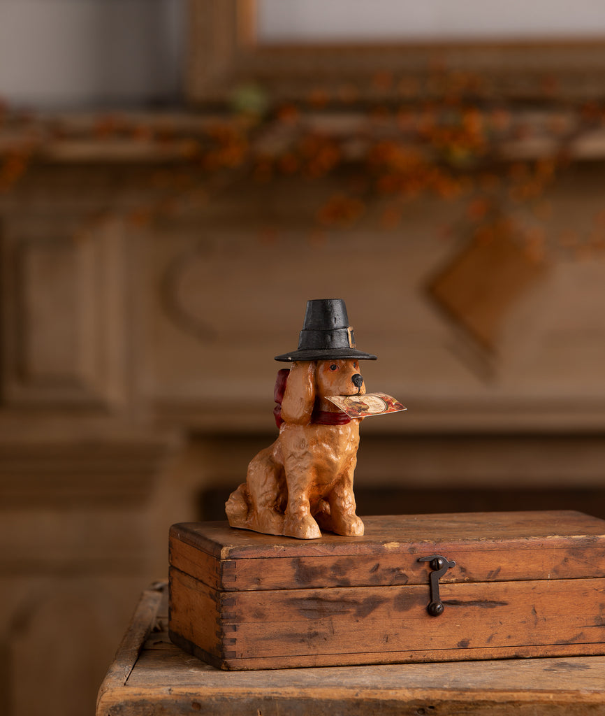 This golden, Thanksgiving dog by Bethany Lowe Designs is hand-painted and vintage inspired. He has a brick red bow around his neck and Pilgrim's hat on his head and is holding a Thanksgiving letter in his mouth.