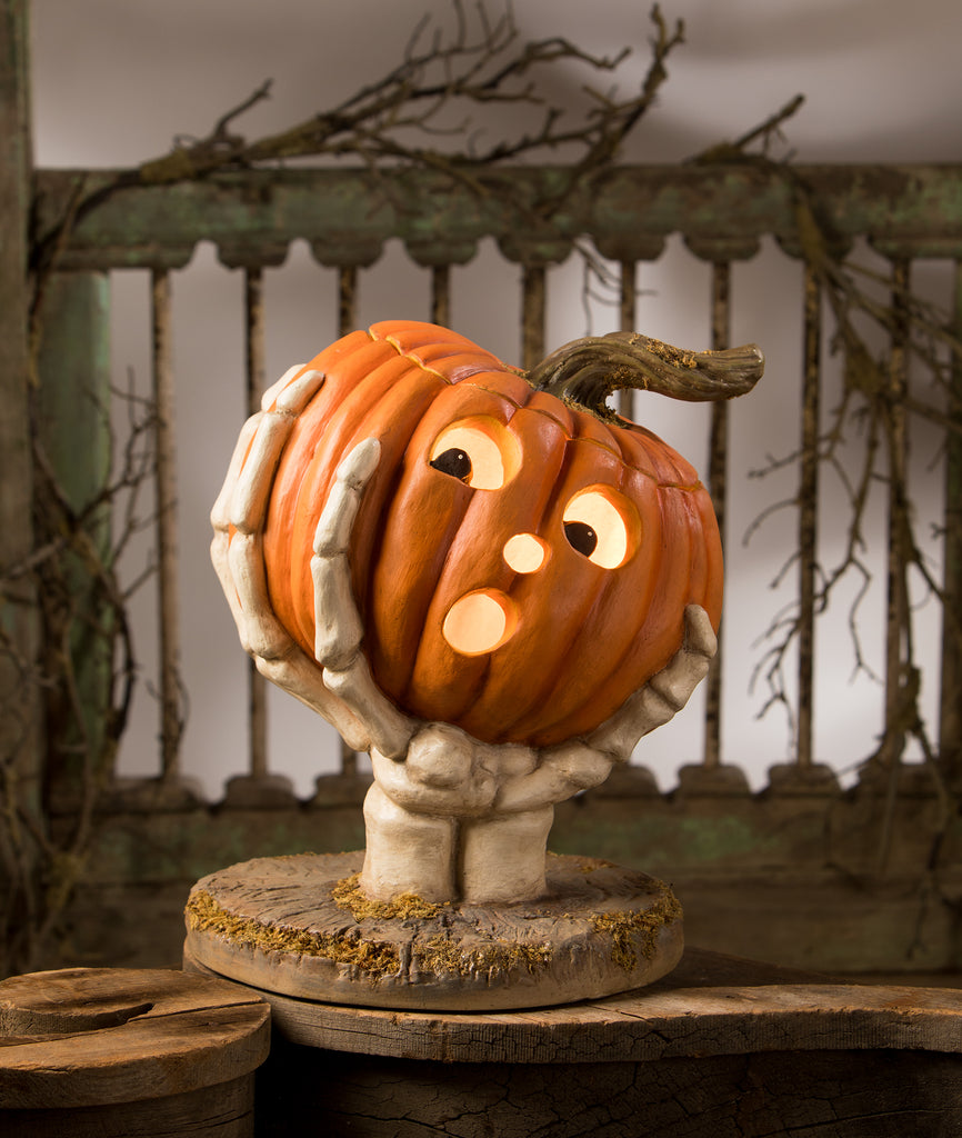 UT-Oh.... This skeleton hand has gotten ahold of this Jack-O-Lantern! The pumpkin has cut-out eyes, nose, and mouth. The lid of the pumpkin comes off so you can add a battery operated candle to allow this pumpkin to glow. The skeleton arm and pumpkin is resting on top of a base sculpted and painted to look like wood. Light not included. Hand-painted resin and natural moss. 9.75" x 9.75" x 12.25". TD3143.