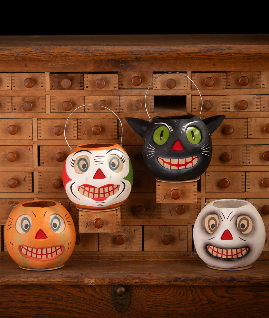 Embrace the playful spirit of Halloween with our Vintage Cat Bucket Small! This delightful reproduction captures the enchanting charm of the original design, bringing a touch of nostalgia to your Halloween decor. Crafted from high-quality paper mache, this adorable bucket features whimsical cat details that add a festive flair to any Halloween display. With convenient paper inserts, you can easily fill it with a flickering light or sweet treats, making it a perfect accent piece for your celebrations. Let this Vintage Cat Bucket Small be a purr-fect addition to your Halloween festivities! This piece is carefully antiqued and distressed by hand to give it a unique, vintage look. Each one is truly one of a kind, with slight variations that add to its charm and character. Light not included.