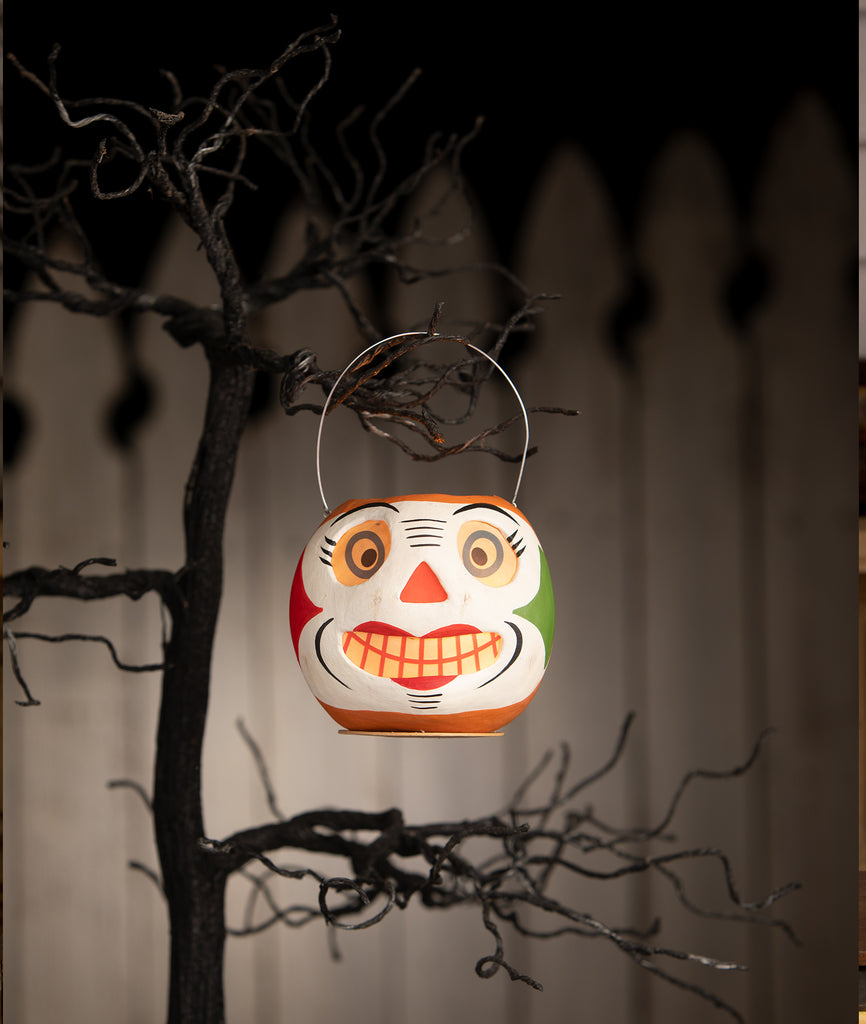Step right up and embrace the nostalgic charm of our Vintage Clown Bucket! This delightful reproduction captures the whimsical spirit of classic Halloween decor, beautifully crafted to mirror the original design. Made from sturdy paper mache, this charming bucket features paper inserts that allow you to fill it with a warm glow from a light or sweet treats for all to enjoy. Whether as a standalone Halloween decoration or part of your festive collection, this Vintage Clown Bucket is sure to bring smiles and a touch of whimsy to your celebrations! This piece is carefully antiqued and distressed by hand to give it a unique, vintage look. Each one is truly one of a kind, with slight variations that add to its charm and character. Light not included.